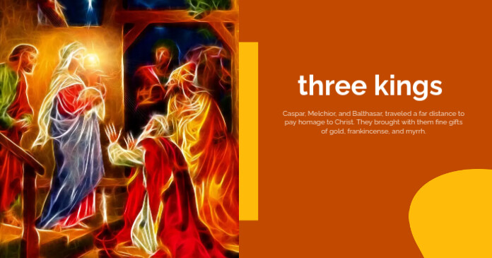 Three wise men, or Magi as they were known, whose names were Caspar, Melchior, and Balthasar, traveled a far distance to pay homage to Christ. They brought with them fine gifts of gold, frankincense, and myrrh.
