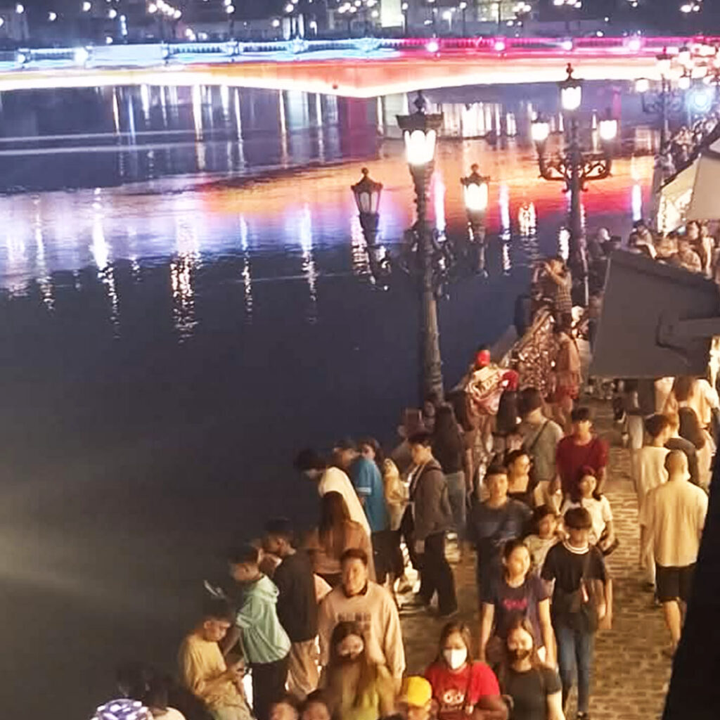 Christmas vibe, sunset strolls, evening dining, and late-night hangouts, with food stalls, holiday crowd and lights active during these times.