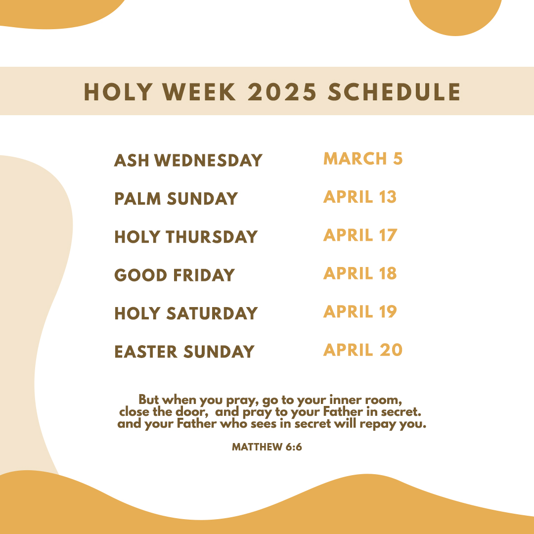 Holy Week 2025 Schedule Posted in by lizflores Holy Week 2025 Schedule142 DownloadsFree Download Holy Week 2025 Schedule Free Download: Holy Week 2025 Schedule February 28, 2025 /